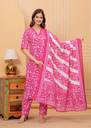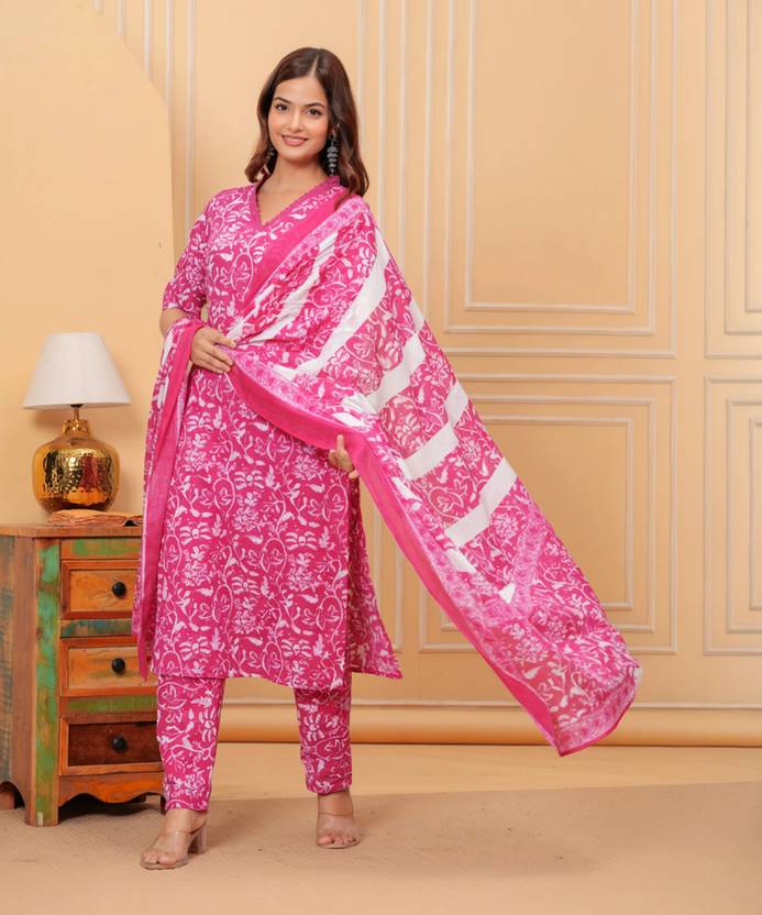 Floral Printed V-Neck Straight Kurta With Pant Dupatta Set