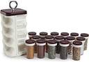 Spice Rack Set for 16 container set ideal storage solution for spice and herbs unbreakable body easy to clean transparent container for easy access and pick of containers revolving stand for east access and pick of containers shake and pore with multiple hole selection sleek and elegant look add flavor to your kitchen decor simple durable and comfortable to use storage container. The wood finish look of the top give extra décor to your kitchen. Twelve pieces storage jars gives facility of store almost all your herbs and spices required during, routing course of usage. Twelve jars each with three opening give facility for shake and spray as per the required material. Easy revolving of the stand helps for easy movement of jar all round 360 degree. Jars and body are made from the high quality food grade plastic which helps in odourless and hygienic storage of our herbs and spices.