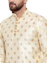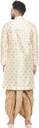 The elaborate leaves strewn throughout the kurta are what distinguish the ensemble. Each leaf's intricate pattern ensures that you seem put together while introducing a touch of refinement to your appearance. The solid design of the dhoti goes nicely with the leafy motif of the dhoti to ensure a polished look.