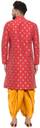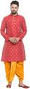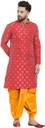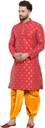 Look your ethnic best wearing this coloured Ganesh print Kurta Dhoti set for men from the fashion house of Larwa. Made from banarasi Jacquard, this regular-fit Ganesh print Kurta Dhoti set comprises a full-sleeved kurta and Dhoti to complete your look. Team this outfit with embroidered mojris and rock the party that you attend.