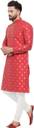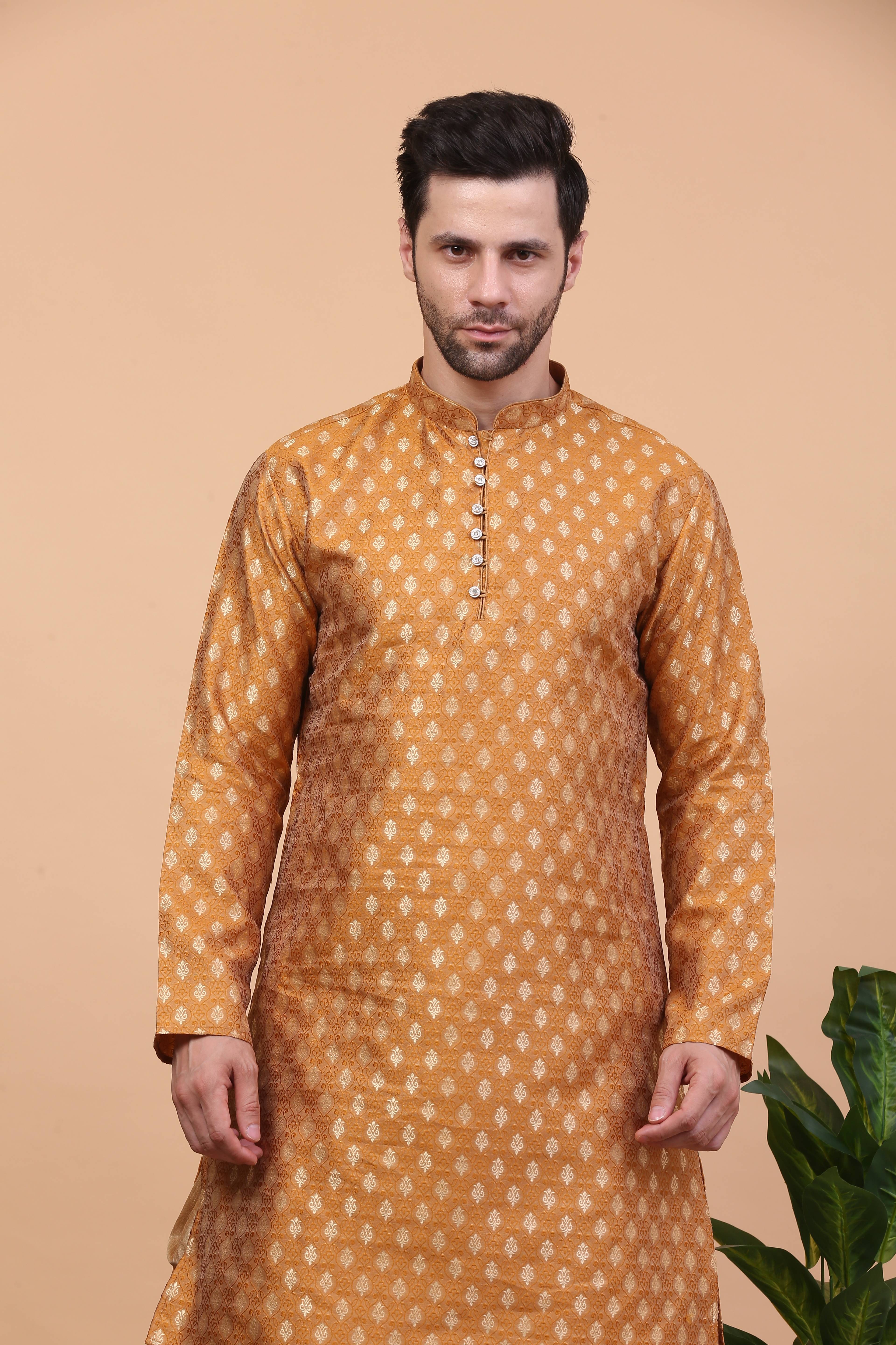Look your ethnic best wearing this coloured Ganesh print Kurta Pyjama set for men from the fashion house of Larwa. Made from banarasi Jacquard, this regular-fit Ganesh print Kurta Pyjama set comprises a full-sleeved kurta and Pyjama to complete your look. Team this outfit with embroidered mojris and rock the party that you attend.