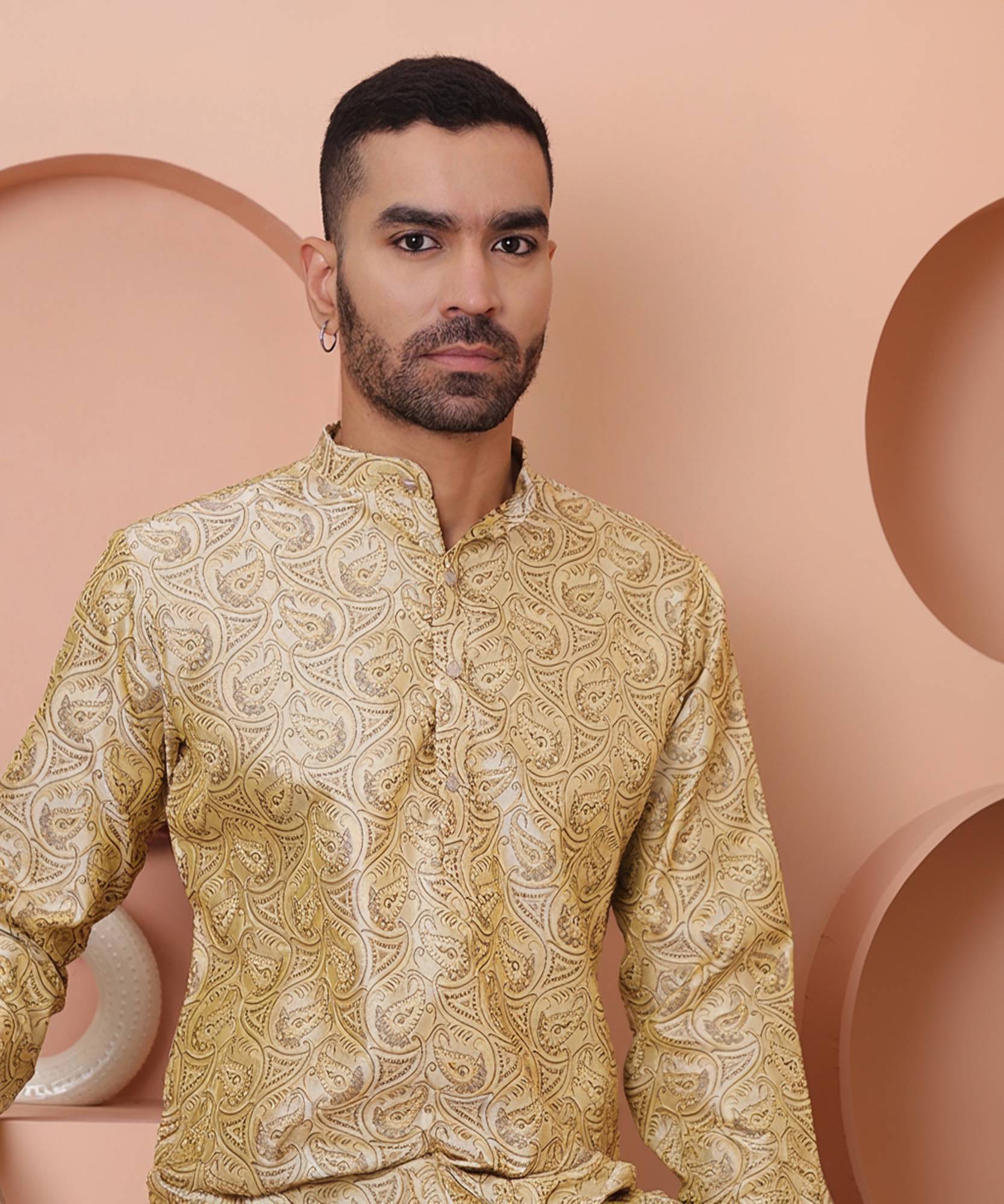 The kurta is crafted from rich Jacquard fabric featuring subtle woven patterns that exude royal charm and fine craftsmanship. It offers a perfect blend of traditional aesthetics and modern tailoring, ensuring a sharp and graceful look.