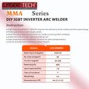 CAPACITY: 250A VOLTAGE: 220V RATED DUTY:60% ELECTRODE: 4MM ACCESSORIES: MASK BRUSH, ELECTRODE HOLDER: 1.8MTR EARTH CLAMP: 1.2MTR POWER CABLE:1.8MTR