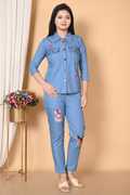 This stylish girls' denim top with jeans pant set is perfect for a casual, chic look. The denim top features a relaxed fit, offering comfort and easy movement while maintaining a trendy appearance. With classic buttons or snap closures, the top can be dressed up or down, depending on the occasion. Paired with matching denim jeans, this outfit is ideal for everyday wear, offering versatility and style for various activities.