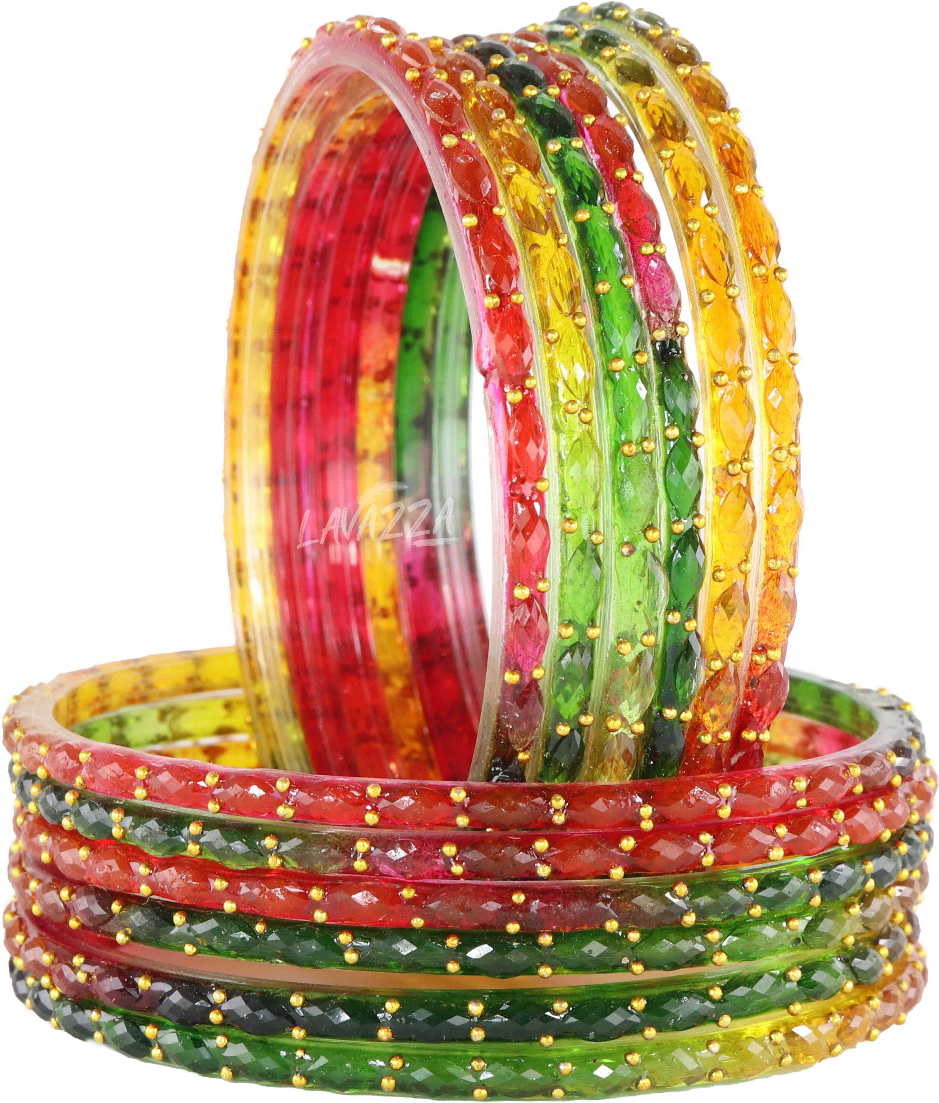 Presents Trending Crystal Raindrop Glass Bangles Set For Women & Girls. These Stylish Glass Bangles Set is combination of both Modern Elegant Style and Traditional Feel, and perfect to enhance your essence in a Wedding, Party, or Special Occasion. These Bangles are made from High-quality Clear Transparent Glass material, Golden Zircon Diamond Stone, & Ball Beads. The Beautiful Crystal design showcases LAVAZZA's skillful craftsmanship, ensuring you shine on your special day. These Raindrop Bangles complementing a wide range of outfits, including classic sarees and modern lehengas. prides itself on offering the finest quality, timeless style, and unwavering commitment to tradition. The set is designed to make your special day extra special, ensuring you look and feel your best. Elevate your bridal ensemble with Glass Chudi Set and make memories that will last a lifetime. These LAVAZZA's Designer Glass Bangles Set Have a Premium Finish and are Perfect for Weddings, Engagements, Special Functions, Festivals, Rituals, Bridal Shower, Anniversary, Events and Daily wear also. The Brand sells all types of Glass Bangles, Metal Bangles, Acrylic Bangles, Chuda Sets, Latkan Bangles Sets, Kada Sets, Bracelets, and many More. Please Refer you Bangles Size from our Size Chart to Know it Precisely. CARE: To maintain longevity, clean bangles with a smooth cotton cloth, avoid direct water, perfume, deodorant, sunlight, and chemicals, and store them in an airtight zip-lock pouch. Thank You For Choosing LAVAZZA's Glass Bangles Collection on .