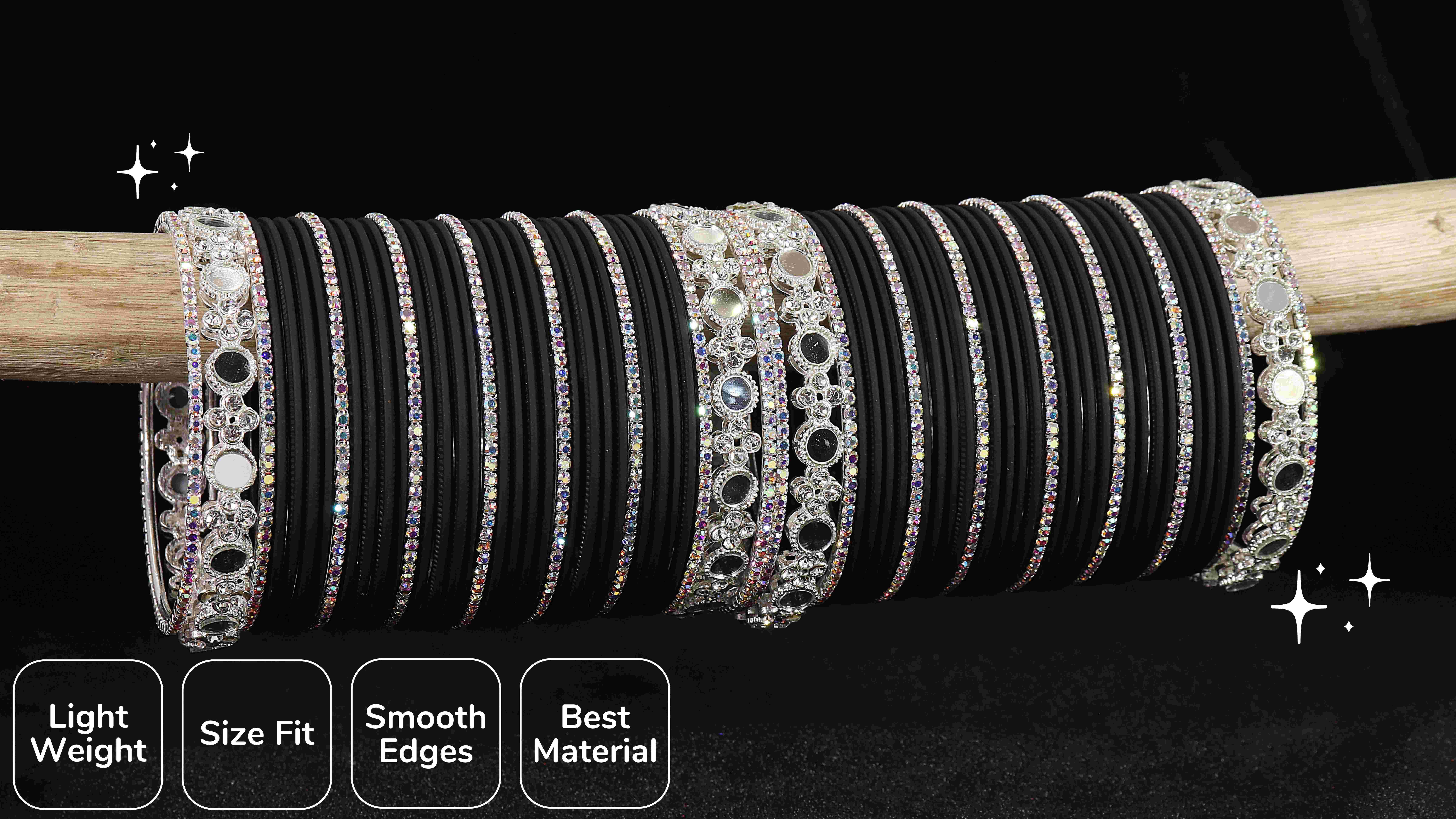 LAVAZZA Stylish Metal Mirror Work White Stone Bangles Set For Women & Girls | Diamond Bangles | Metal Bangles | Chudi Set | White Stone Bridal Chuda Set | Trendy AD Chooda Bangles-(FMS4-Black-2.2)