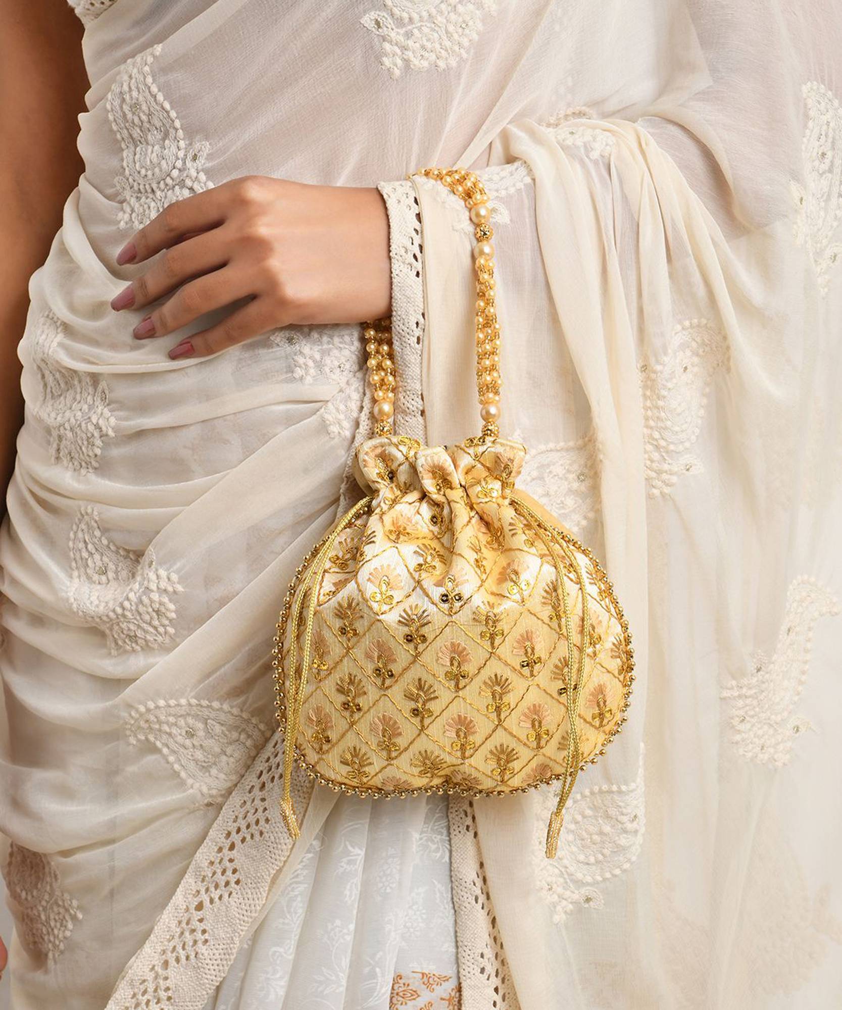 Upgrade your wedding/ festival accessories more with this Gorgeous potli. This beautiful Potli bags are made of sequin lace.You can easily carry big mobile phone, valuables items, cosmetics, etc. as this potli having spacious compartment,This Potli bag have beautiful handle, made with high quality pearls which look awesome and easy to carry.