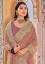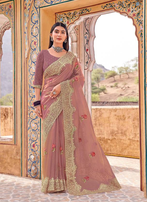 Drape yourself in elegance with this exquisite purple saree, crafted from luxurious tissue organza. The entire saree is beautifully adorned with intricate floral embroidery motifs that add a delicate charm while giving the drape a rich and ornate look. Accentuating the design is a heavy zari lace border, which lends a regal touch and highlights the sareeās graceful silhouette.