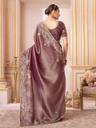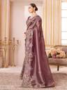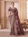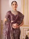 The saree is adorned with heavy floral embroidery in zari and thread work, creating a rich and eye-catching design. Paired with a matching purple silk blend blouse with embroidery, this ensemble offers a coordinated, festive-ready look that is perfect for celebrations.