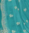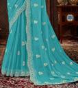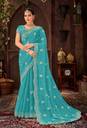 Radiate subtle glamour in this turquoise blue tissue saree, adorned with a delicate floral border embellished with tiny stones that lend a soft shimmer. Scattered all over the saree are small floral motifs, adding a touch of graceful charm to the lightweight, translucent drape.