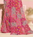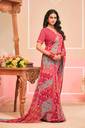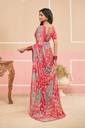 The matching blush pink georgette blouse comes in a coordinated printed design, blending seamlessly with the saree’s contemporary look for a cohesive and stylish ensemble.