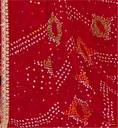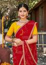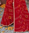 Celebrate timeless tradition with this vibrant red georgette saree, beautifully adorned with classic Bandhani tie-dye patterns in hues of white, yellow, and green. The intricate circular and linear motifs reflect the rich heritage of Indian craftsmanship, while delicate foil mirror accents add a soft, festive shimmer. A graceful zari lace border enhanced with sequins and silver dew drop detailing lends an elegant finish to the drape. Lightweight and fluid, the saree ensures both comfort and flair. It comes paired with a contrasting mustard printed georgette blouse, perfectly complementing the saree’s vivid charm.
