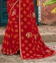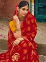 Add a touch of festive charm with this Red Chiffon Saree, paired with a contrasting Mustard Printed Blouse. Crafted in soft chiffon for a fluid drape, the saree is adorned with yellow bandhani-inspired motifs that bring a traditional appeal. Enhancing its beauty, the drape also features foil-printed bird bunch motifs that add a unique and artistic touch. A rich zari lace border completes the saree with a hint of shimmer and elegance.
