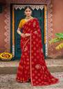 The look is paired with a mustard chiffon printed blouse, creating a vibrant contrast to the red saree. Perfect for festive occasions, weddings, and cultural celebrations, this saree blends tradition with stylish detailing.