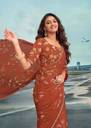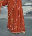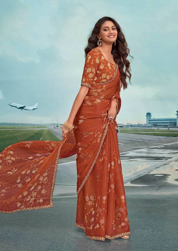 Step into understated elegance with this exquisite brown chiffon saree, a perfect blend of tradition and modern charm. The saree features an all-over floral print in delicate yellow and white motifs, evoking a soft, graceful aesthetic. Scattered sequin flowers add a gentle shimmer, catching the light just enough to elevate the look without overpowering it. The subtle silver zari edging lends a refined finish, making the saree ideal for both daytime festivities and evening celebrations. Paired with a brown silk blouse that mirrors the saree’s floral print in the same yellow and white hues, the ensemble is thoughtfully coordinated to offer a cohesive and sophisticated appeal. Lightweight, flowy, and effortlessly graceful, this saree is perfect for festive gatherings, cultural events, or intimate occasions where timeless style makes all the difference.