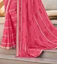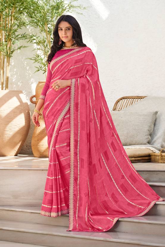 Enhance your ethnic charm with this Pink Chiffon Saree, paired with a matching Printed Blouse. Designed in soft chiffon for a graceful drape, the saree features an all-over geometric print with small motifs, giving it a modern yet traditional appeal. Adding to its festive touch, foil stripes run horizontally across the drape, lending a subtle shimmer.