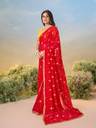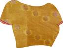 Bring timeless elegance to your wardrobe with this georgette saree, paired with a contrasting mustard silk blouse. The saree is adorned with evenly arranged small yellow dots, reflecting the traditional Bandhani-inspired style. Scattered floral motifs in white and yellow add a delicate decorative touch, while the fine golden zari border frames the saree beautifully, enhancing its richness without overpowering the design.