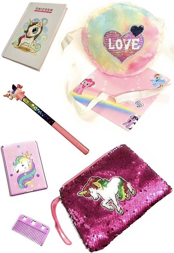 Le Delite Multicolor Sling Bag Unicorn fur sling bag cute sling bag unicorn mirror unicorn makeup accessories unicorn comb unicorn mini spiral diary with pen unicorn birthday combo- Multi color (Pack of 5)