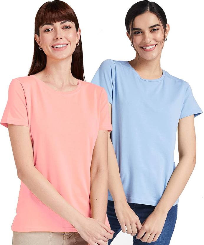 Leafoo Pack of 2 Women Solid Round Neck Polycotton Multicolor T-Shirt