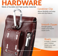 This pouch comes with a belt loop and metal carabiner, adding to its versatility. It includes an elegant zipper and slider, enhancing both functionality and style. With sufficient space to store phones, tools, cards, and power banks, it serves multiple purposes. The design ensures that items are kept secure and easily accessible.