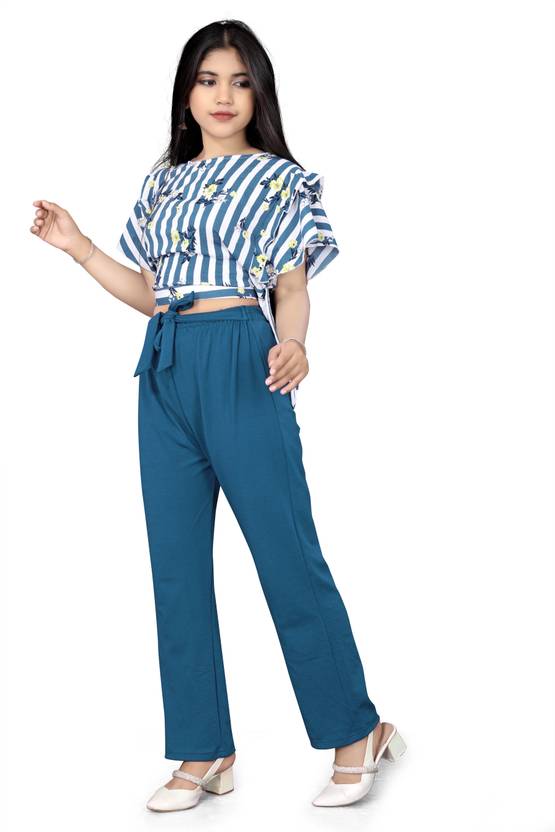 This elegant girls' top and trouser set in teal green and white features a lightweight, stretchable, and smooth fabric, making it perfect for all seasons. Whether it's for a party, wedding, Pongal celebration, or birthday party, this versatile set offers both comfort and style. Available in sizes 4 to 16 years, it's a great choice for any special occasion.