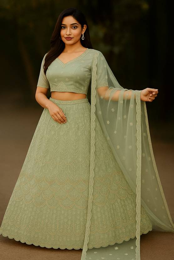 Topwear Fabric: Net Bottomwear Fabric: Net Dupatta Fabric: Net Set type: Choli And Dupatta Top Print or Pattern Type: Embellished Bottom Print or Pattern Type: Embroidered Dupatta Print or Pattern Type: Embroidered Sizes: Semi Stitched (Lehenga Waist Size: 42 in, Lehenga Length Size: 42 in, Duppatta Length Size: 2.05 m)