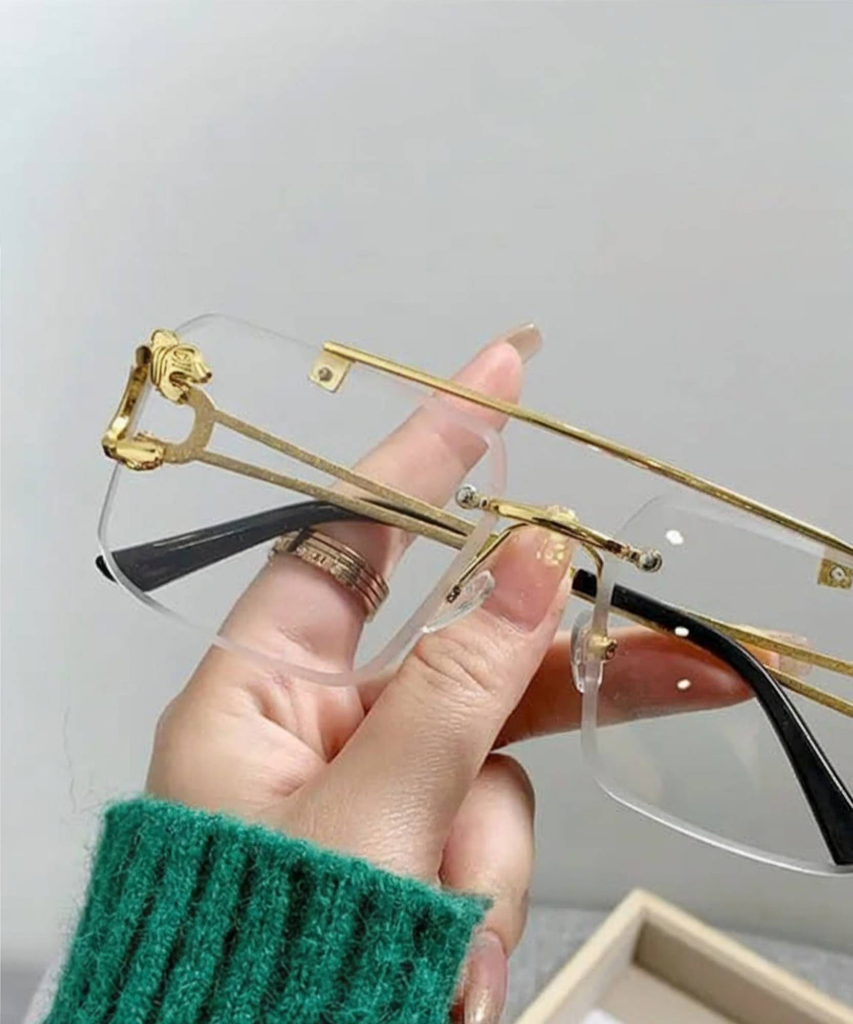 Featuring a rimless square frame with subtle detailing, this eyewear reflects a refined sense of balance between contemporary and classic style. Distinctive decorative elements on the temples introduce a creative accent. Further, mirror-shaped edges highlight craftsmanship in a precisely moulded structure. Moreover, each line and curve forms graceful contours.