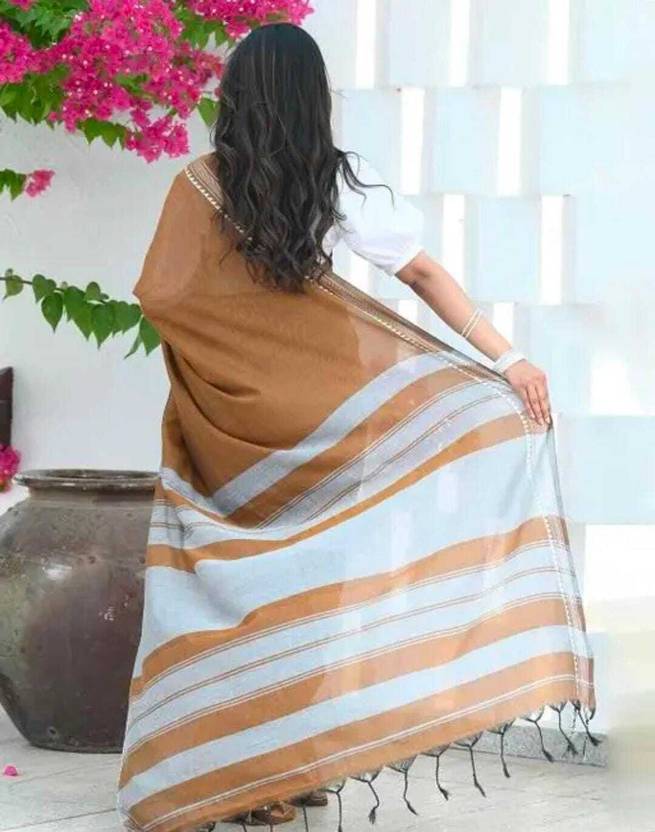 LeheriyaLoom Striped Handloom Cotton Blend Saree (Beige, White)