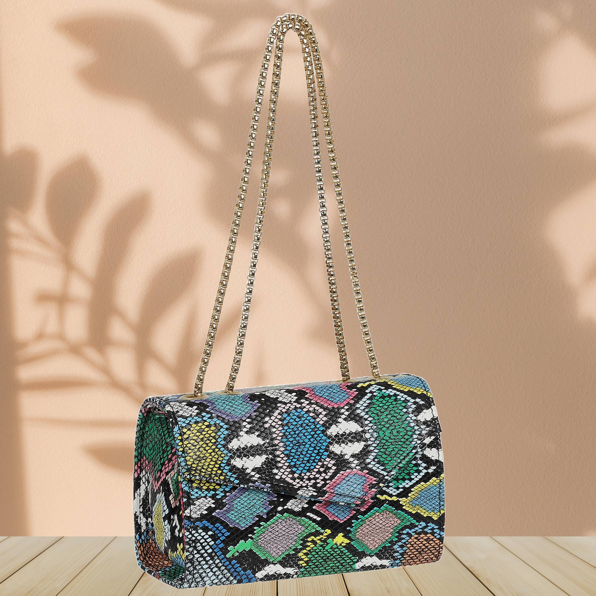 The bag’s eye-catching multicolor design is a harmonious blend of hues, adding a splash of vibrancy to your everyday look., dual-handle carry style,, spacious compartment layout