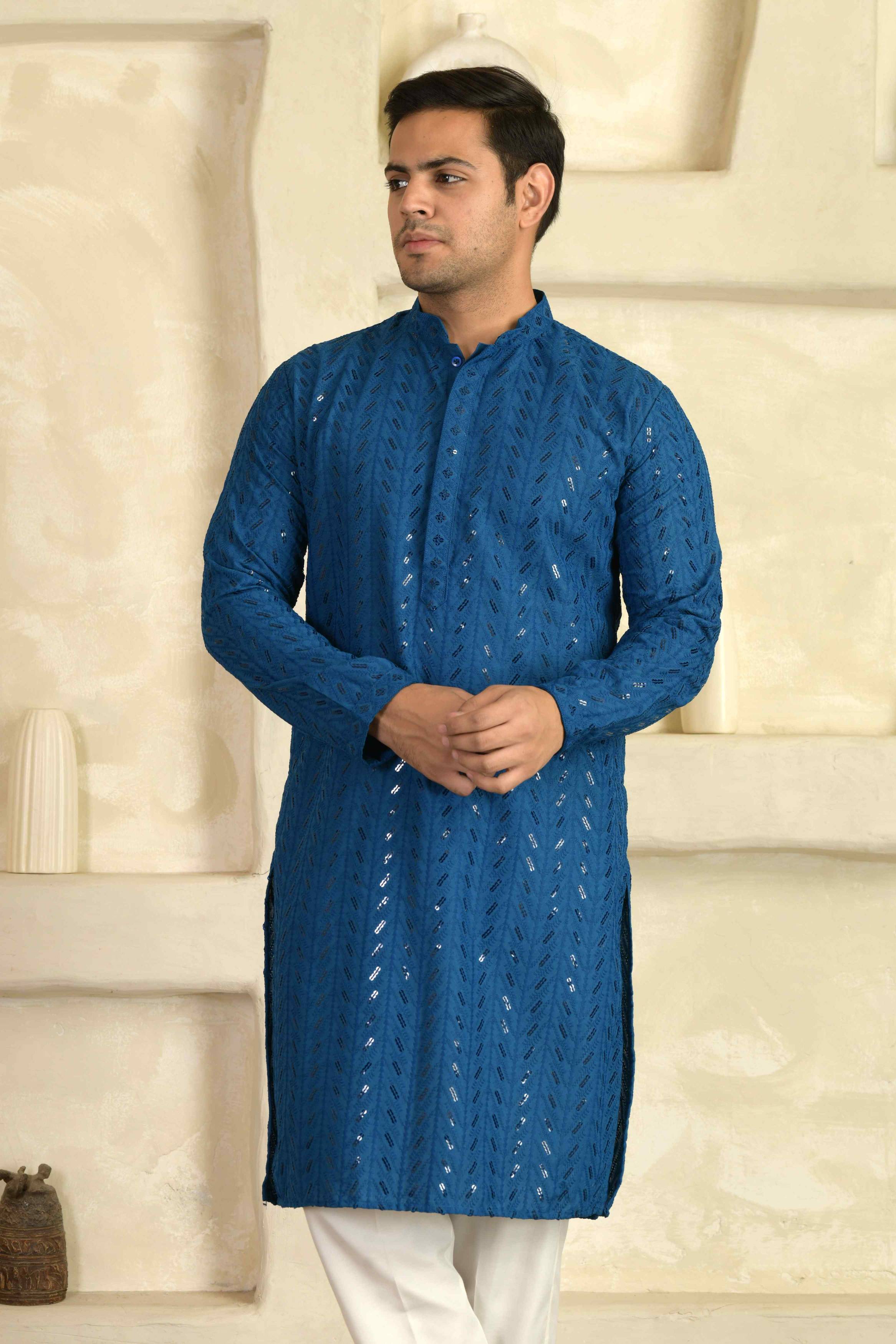 sequenced embroidery kurta pajama set for men, ideal for weddings, Diwali, Navratri, Eid, Holi, Raksha Bandhan, and festive occasions.