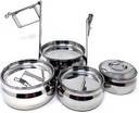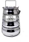 stainless steel pyramid /handi tiffin , lunch box contain 4 boxes and 1 tight lock . high quality steel . weight is 1100 gm approx . leroyal tiffing best for school , college ,*** office ***