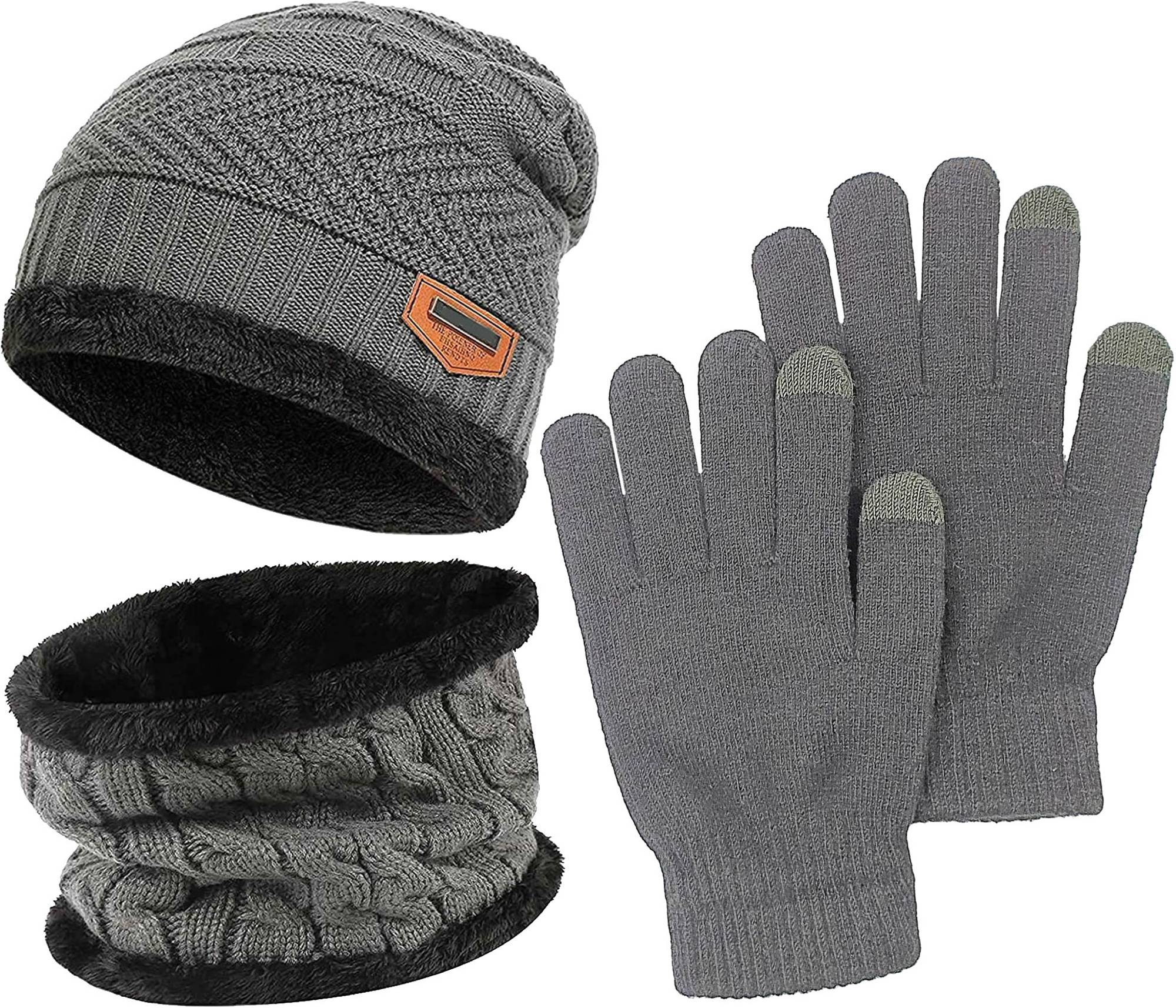 Winter Warm Woolen Beanie Cap Neck Set Grey with Hand Gloves