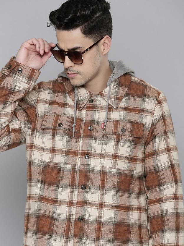 Rust Orange & Off White checked tailored jacket Has a hood2 flap pockets Has a button closure Long sleeves Curved hemline