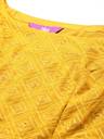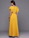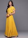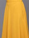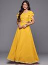 Our 2-piece mustard yellow solid-tone lehenga choli set, crafted in flowy georgette fabric, features a crop top with a round neckline, ruffle detailed sleeves, and a functional side-zip closure. Complemented with a flared skirt with a partially elasticated waistband with a zip closure. Adorned with sequins detailing, thread work, and Gota Patti accents, this charming style is perfect for festive celebrations.