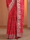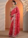 Red bandhani printed saree with zari embellished border and a blouse piece