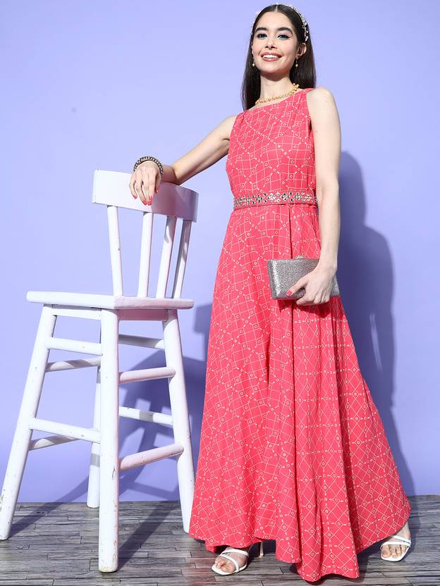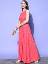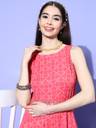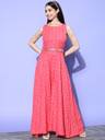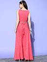 Our coral red geometric print sleeveless cotton jumpsuit features a functional back-zip closure and a flared asymmetrical hemline. Complemented with an embroidered belt with handcrafted dori details at the back, this charming style is perfect for casual outings.