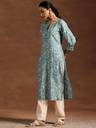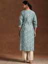 Our blue printed straight-fit kurta, crafted in silk fabric, features a keyhole neckline and three-quarter bishop sleeves. Elevated with captivating floral prints, this style is perfect for casual outings.
