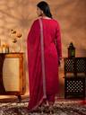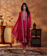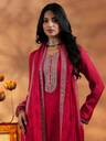 Red floral zari embroidered straight kurta with solid palazzo and floral printed dupatta