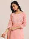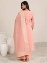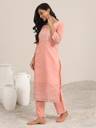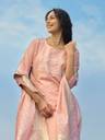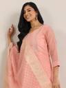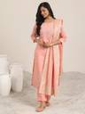 Our 3-piece peach woven design Chanderi silk straight suit set features a kurta with a round neckline, three-quarter sleeves, and a statement yoke. Complemented with trousers with partially elasticated waistband and roomy pockets, and a dupatta. Highlighted with floral woven and sequins, this style is perfect for light festivities.
