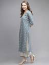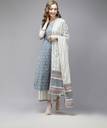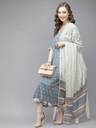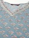 Our 3-piece blue printed cotton suit set features a floral print straight-fit kurta with a V-neckline and three-quarter sleeves. Complemented with trousers with a partially elasticated waistband, and a dupatta. Adorned with floral prints, lace detailing, and fabric-trim accents, this style is perfect for elevated everyday wear.