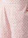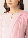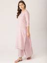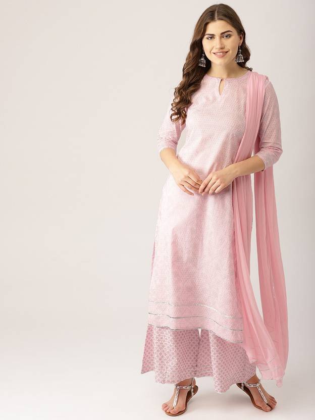 Our 3-piece pink cotton suit set features a printed straight-fit kurta with a keyhole neckline and three-quarter sleeves. Complemented with printed trousers with a partially elasticated waistband and roomy pockets, and a dupatta. Adorned with Gota Patti detailing, this style is perfect for elevated everyday wear.