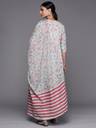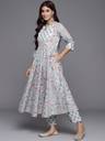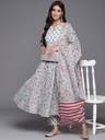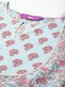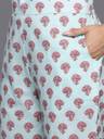 Our 3-piece turquoise blue printed cotton suit set features a floral print Anarkali kurta with a keyhole neckline, pocket detailing, and three-quarter sleeves. Complemented with trousers with a partially elasticated waistband and roomy pockets, and a dupatta. Adorned with Gota Patti detailing, this style is perfect for casual outings.