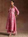 Our 2-piece pink printed cotton kurta set features an A-line kurta with a round neckline and three-quarter sleeves. Complemented with trousers with a partially elasticated waistband and roomy pockets. Elevated with lace accents and fabric-trim detailing, this style is perfect for casual outings.