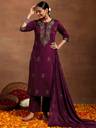 Wine silk blend embroidered straight kurta and trouser with silk blend dupatta