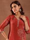 Red floral printed straight kurta with solid trouser and zari work silk blend dupatta