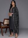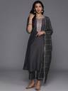 Our 3-piece grey silk blend suit set features a straight-fit kurta with a notched neckline, three-quarter sleeves, and a statement yoke. Complemented with trousers with a partially elasticated waistband and roomy pockets, and a dupatta. Elevated with sequins accents, thread work, and Gota Patti detailing, this style is perfect for light festivities.