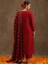 Our 3-piece yellow woven design silk suit set features a straight-fit kurta with a round neckline, three-quarter sleeves, and a statement yoke. Complemented with trousers with a partially elasticated waistband and roomy pockets, and a dupatta in a contrasting hue. Adorned with ethnic motifs woven design, sequins accents, and tassel detailing, this style is perfect for festive celebrations.