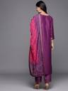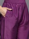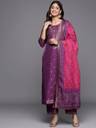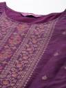 Our 3-piece purple woven design silk blend suit set features a straight-fit kurta with a notched neckline, three-quarter sleeves, and a statement yoke. Complemented with trousers with a fully elasticated waistband and roomy pockets, and a dupatta. Adorned with elaborate ethnic motifs woven design and tassels, this style is perfect for festive celebrations.