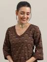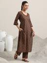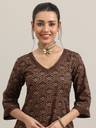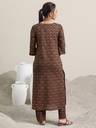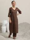 Our 2-piece brown printed cotton straight kurta set features a kurta with a V-neckline and three-quarter flared sleeves. Complemented with trousers with a partially elasticated waistband and roomy pockets. Highlighted with sequins and beaded accents, this style is perfect for casual outings.