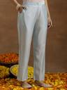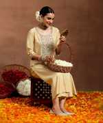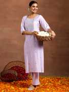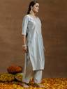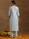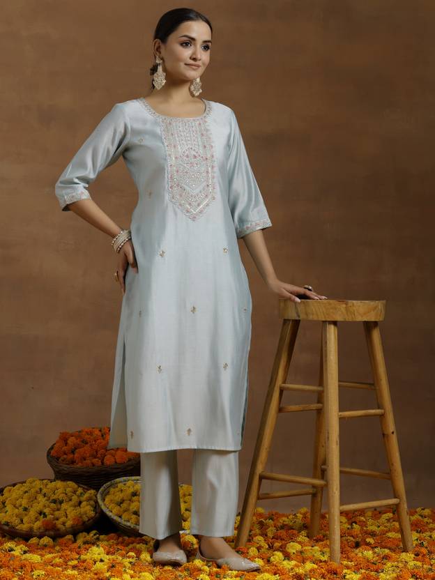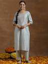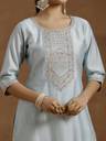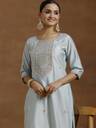 Our 2-piece blue embroidered silk blend straight kurta set features a kurta with a round neckline, three-quarter sleeves, and a statement yoke. Complemented with trousers with a fully elasticated waistband and roomy pockets, and a dupatta. Highlighted with sequins and thread work, this style is perfect for festive celebrations.